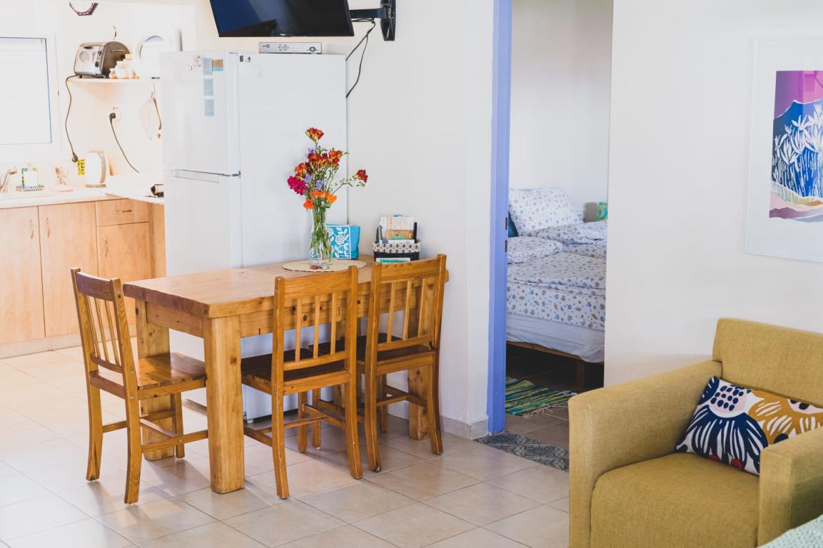 במטבח מכשירי חשמל כמיקרו, טוסטר אובן ופלטה 2 ראשים. במטבחון שולחן אוכל וכסאות - וכך גם בחוץ.